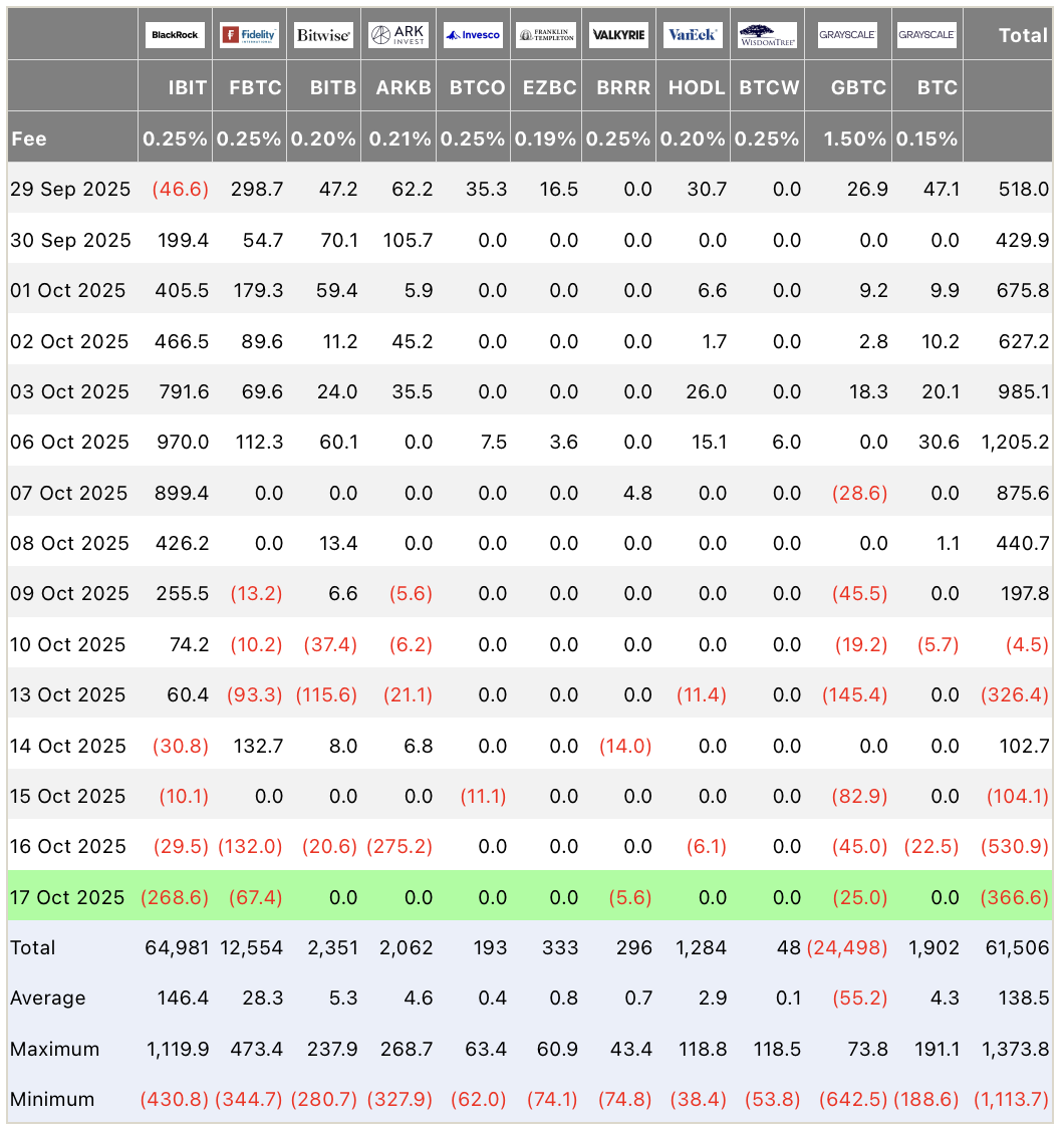 11 спотовых биткоин-ETF в США зафиксировали совокупный отток $366,6 млн 17 октября, что стало финальным аккордом провальной недели для институциональных инвестиционных продуктов на базе биткоина.