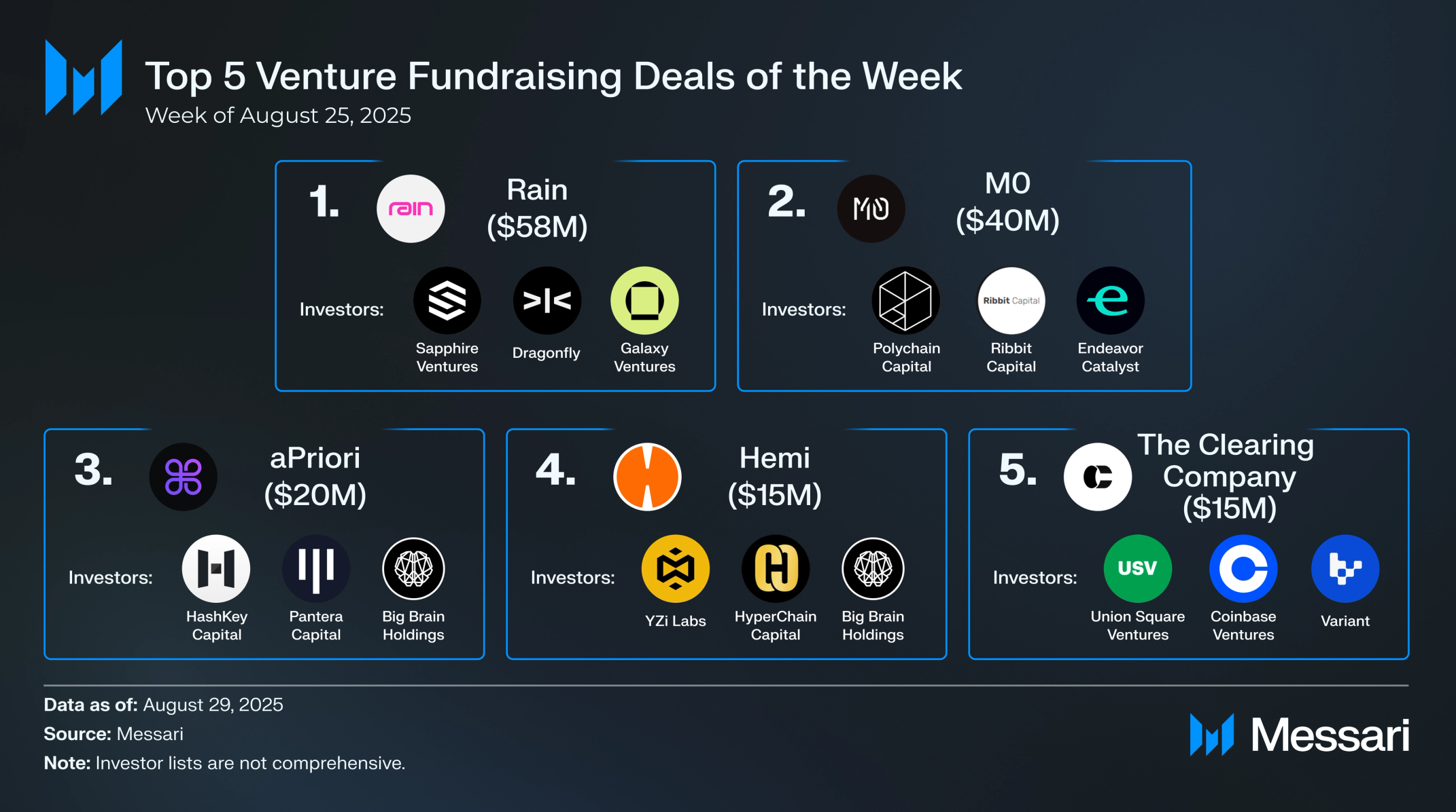 На этой неделе 30 проектов привлекли 255 миллионов долларов, лидерами стали Rain (58 миллионов долларов) и M0 (40 миллионов долларов), а B Strategy, Sharps Technology и DeFi Development Corp. объявили о выделении 1,53 миллиарда долларов на казначейские операции с цифровыми активами. Avail приобрела Arcana, а OKX и Unified Ventures запустили новые фонды на общую сумму 130 миллионов долларов. Луи Томазо предостерег от чрезмерной зависимости венчурной модели от этики основателей, Дэвид Гридер усомнился в том, что рынки недооценивают рост BitMine за счет ETH, а Скотт Коминерс обозначил принципы эффективного регулирования криптовалют. Ниже приводится обзор главных сделок и идей этой недели.